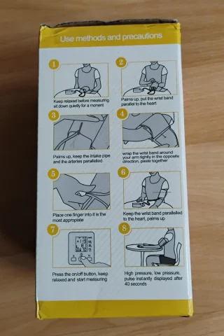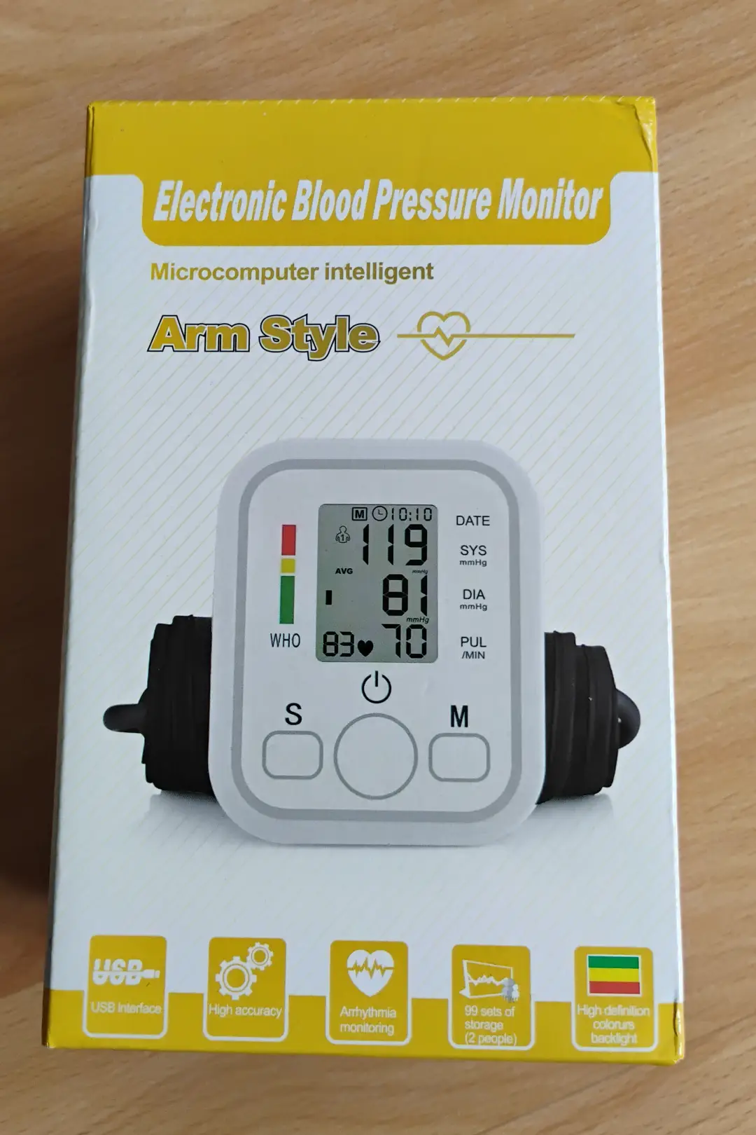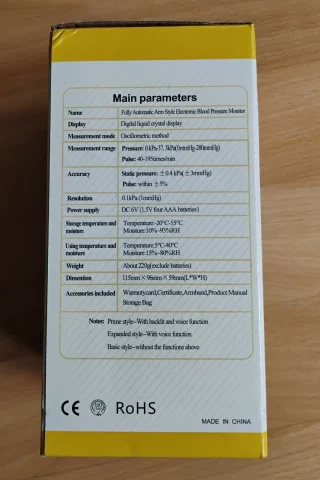 Tensiometrul a venit intr-o cutie din carton subtire dar bun calitativ, pe care nu era scris numele niciunui brand si care nu avea bifata niciuna dintre extraoptiunile posibile: non-voice, voice, lithium battery si contract backlight.