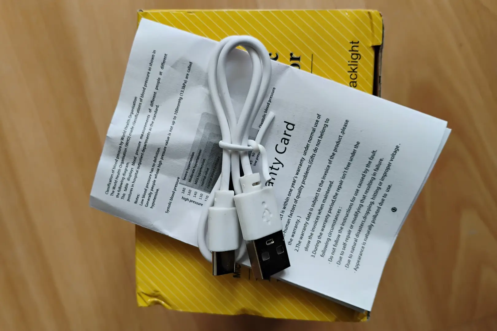 In interiorul cutiei, pe langa tensiometru, a gasit un cablu USB Type C foarte scurt si foarte subtire, precum si un manual cam mototolit scris in engleza cu litere atat de mici incat mai ca aveam nevoie de o lupa pentru a citi. Si credeti-ma, chiar am avut nevoie sa il citesc.