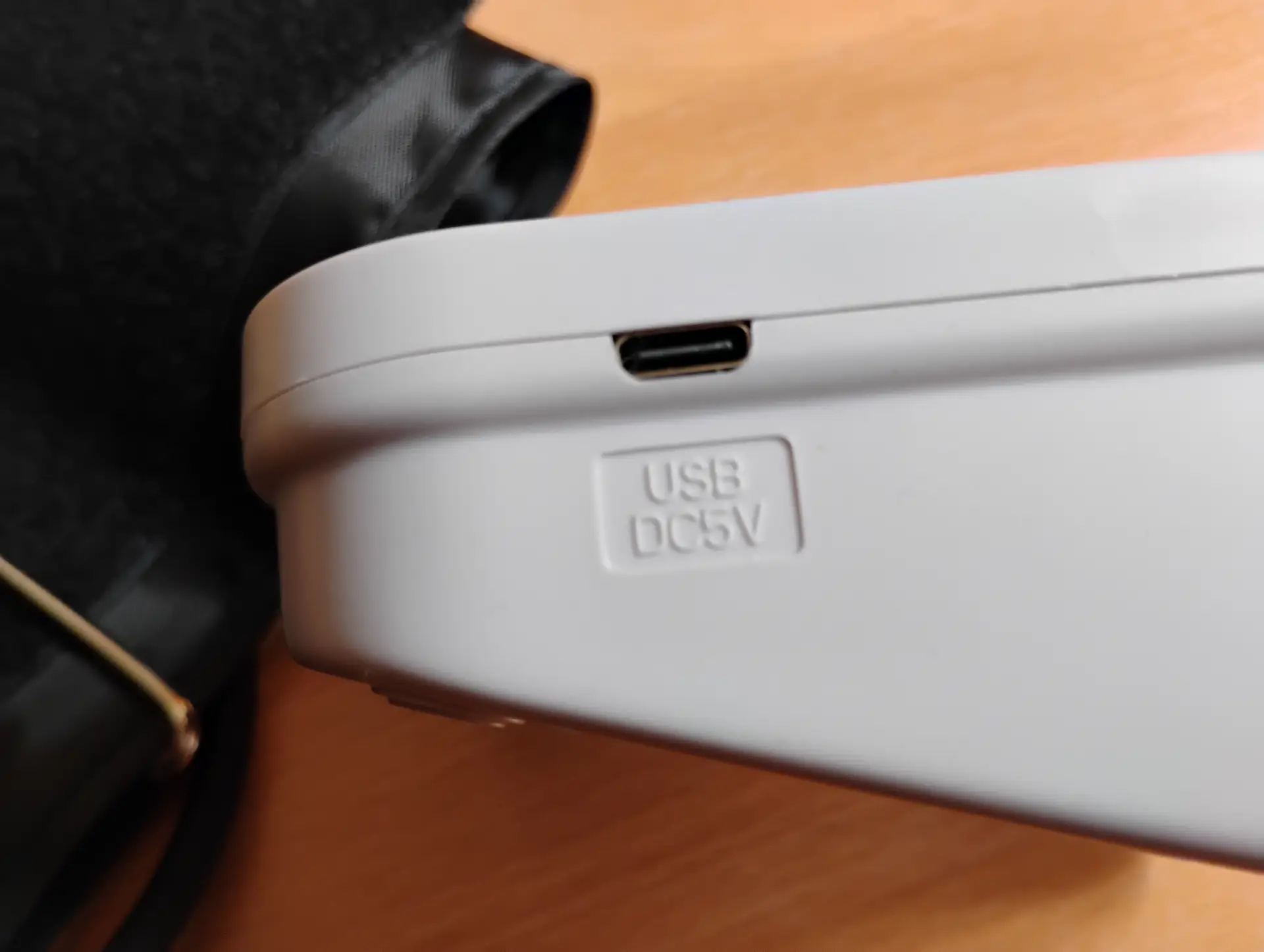 - Pe partea dreapta are o mufa USB Type C si functioneaza fara baterii, doar alimentat de la incarcatorul de telefon.